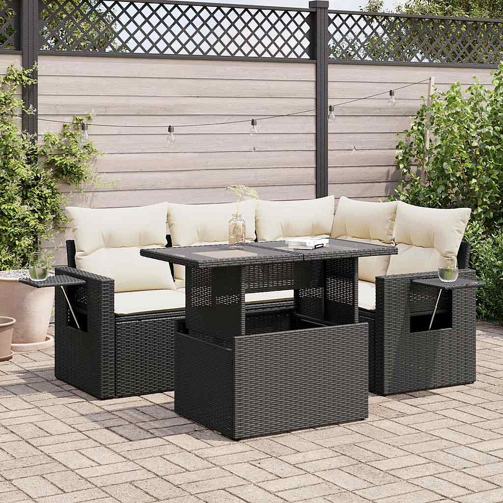 Set Divano da Giardino 6 pz con Cuscini Nero Polyrattan Acacia