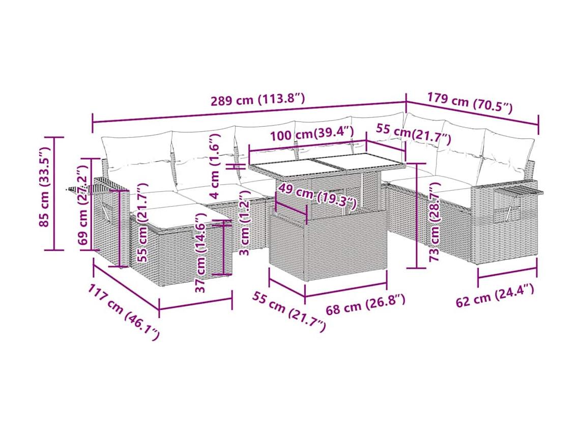 Set Divani da Giardino 9 pz con Cuscini Nero Polyrattan Acacia