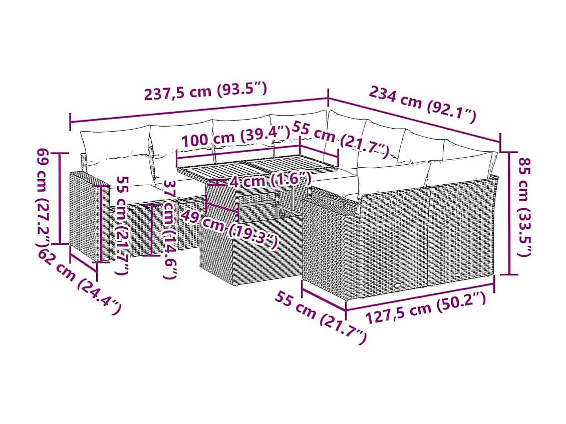 Set Divano da Giardino 9 pz con Cuscini Beige in Polyrattan