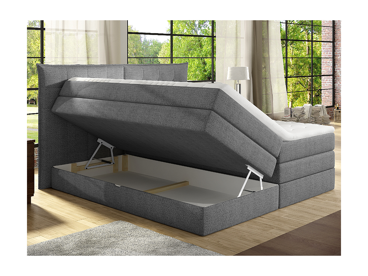 Set letto boxspring con testata + base del letto con contenitore + materasso + topper PLAISIR di PALACIO - tessuto grigio - 180 x 200 cm