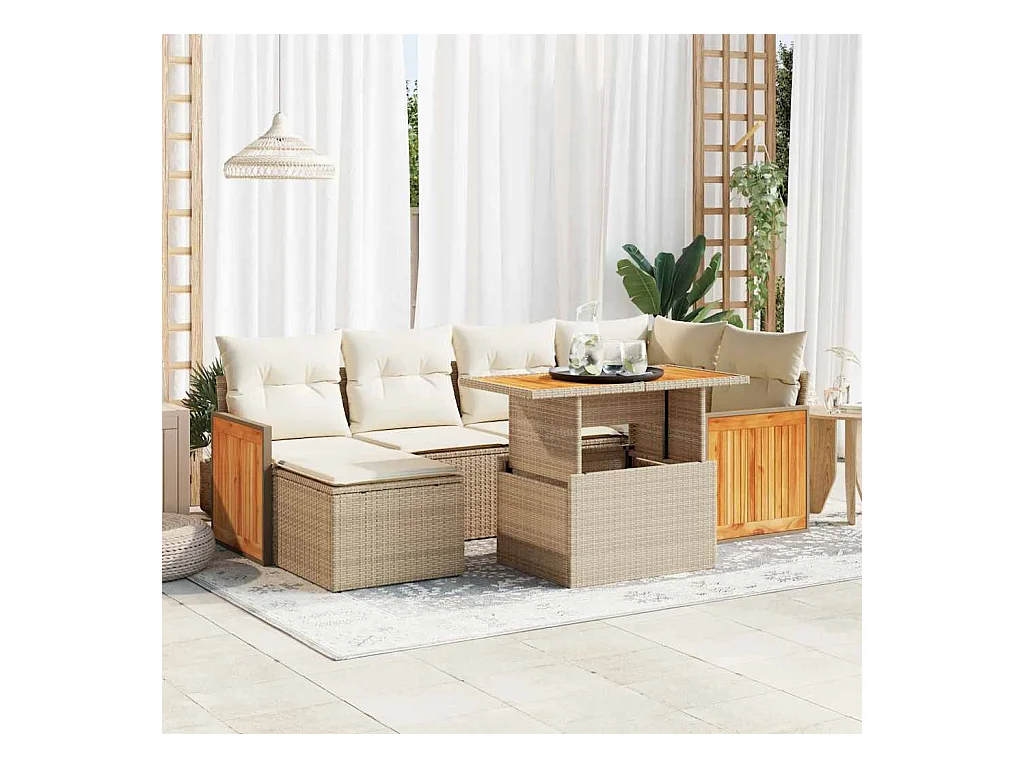 Set mobili da giardino con cuscini 7 pz beige resina vimini acacia
