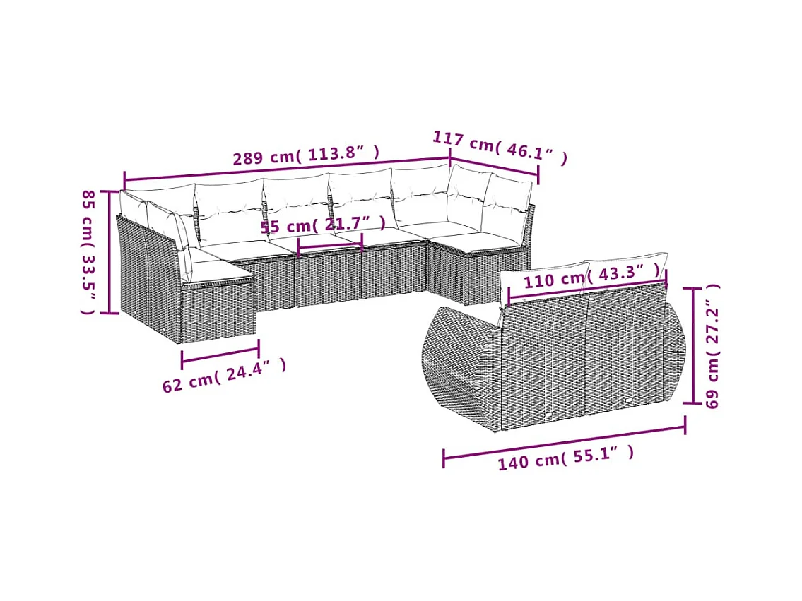 Set mobili da giardino con cuscini 9 pezzi in vimini marrone resina