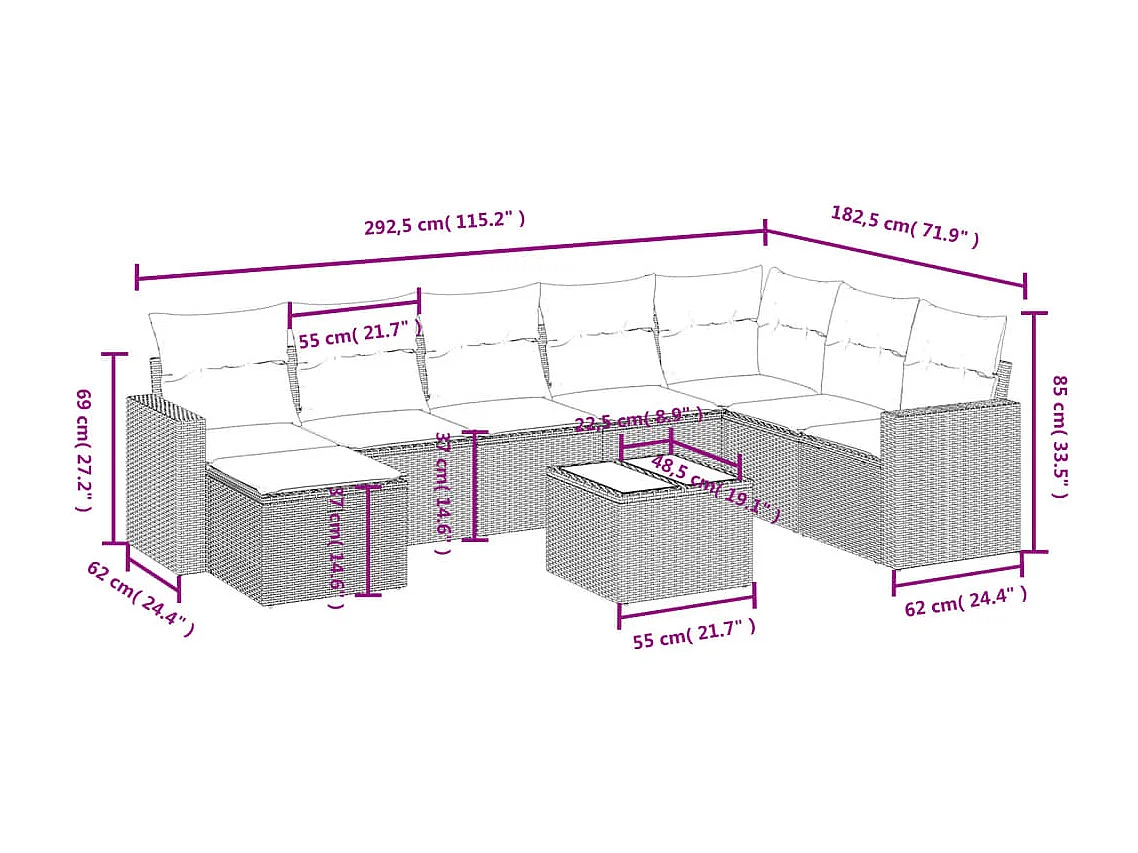 Set mobili da giardino con cuscini 9 pezzi in vimini marrone resina