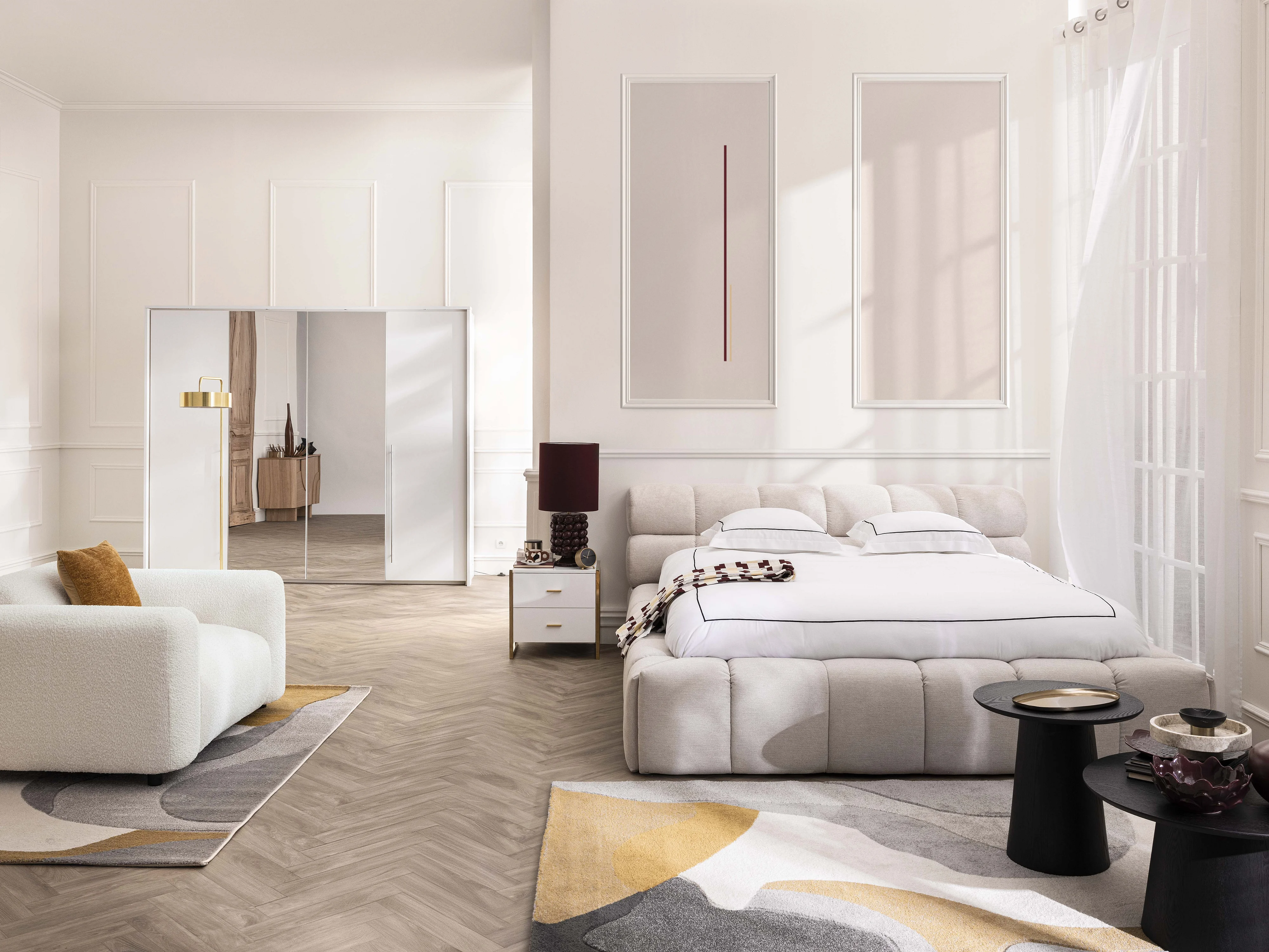 Sgabello basso contenitore portaoggetti in Tessuto bouclette e Metallo Nero Panna - EZEL