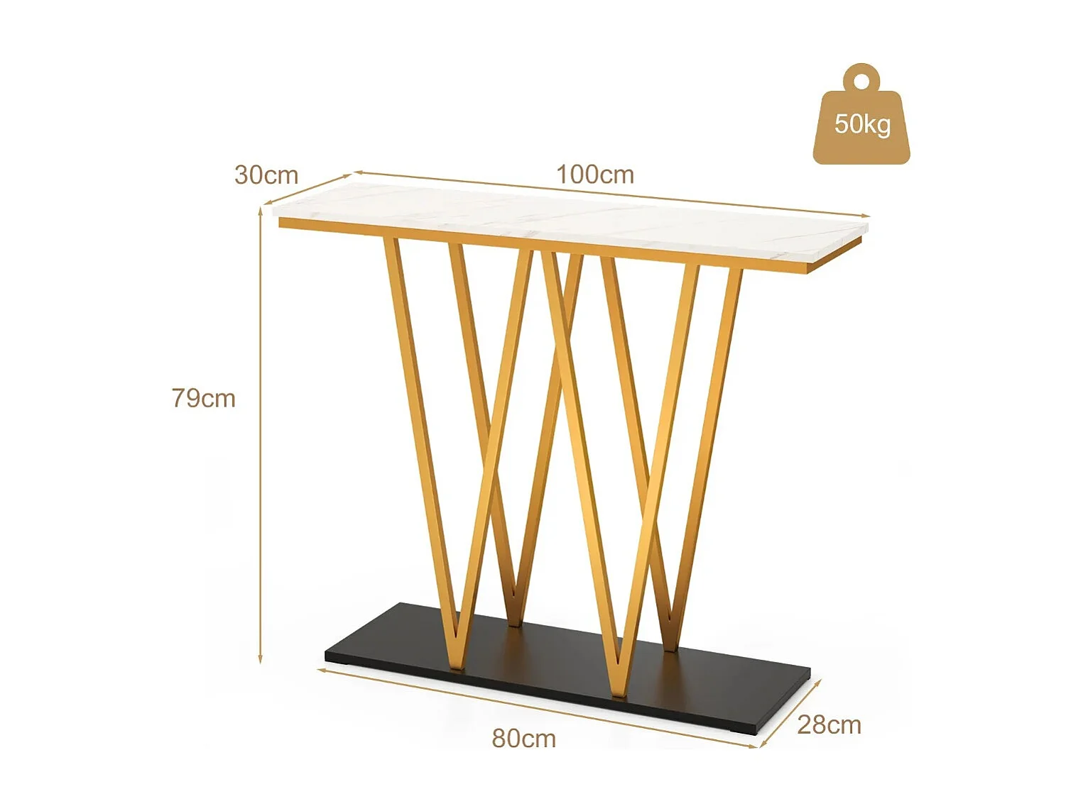 Tavolo console tavolo d'ingresso moderno in marmo finto con telaio geometrico in metallo, Tavolo stretto per soggiorno corridoio Bianco Oro 107 x 40 x 79,5 cm