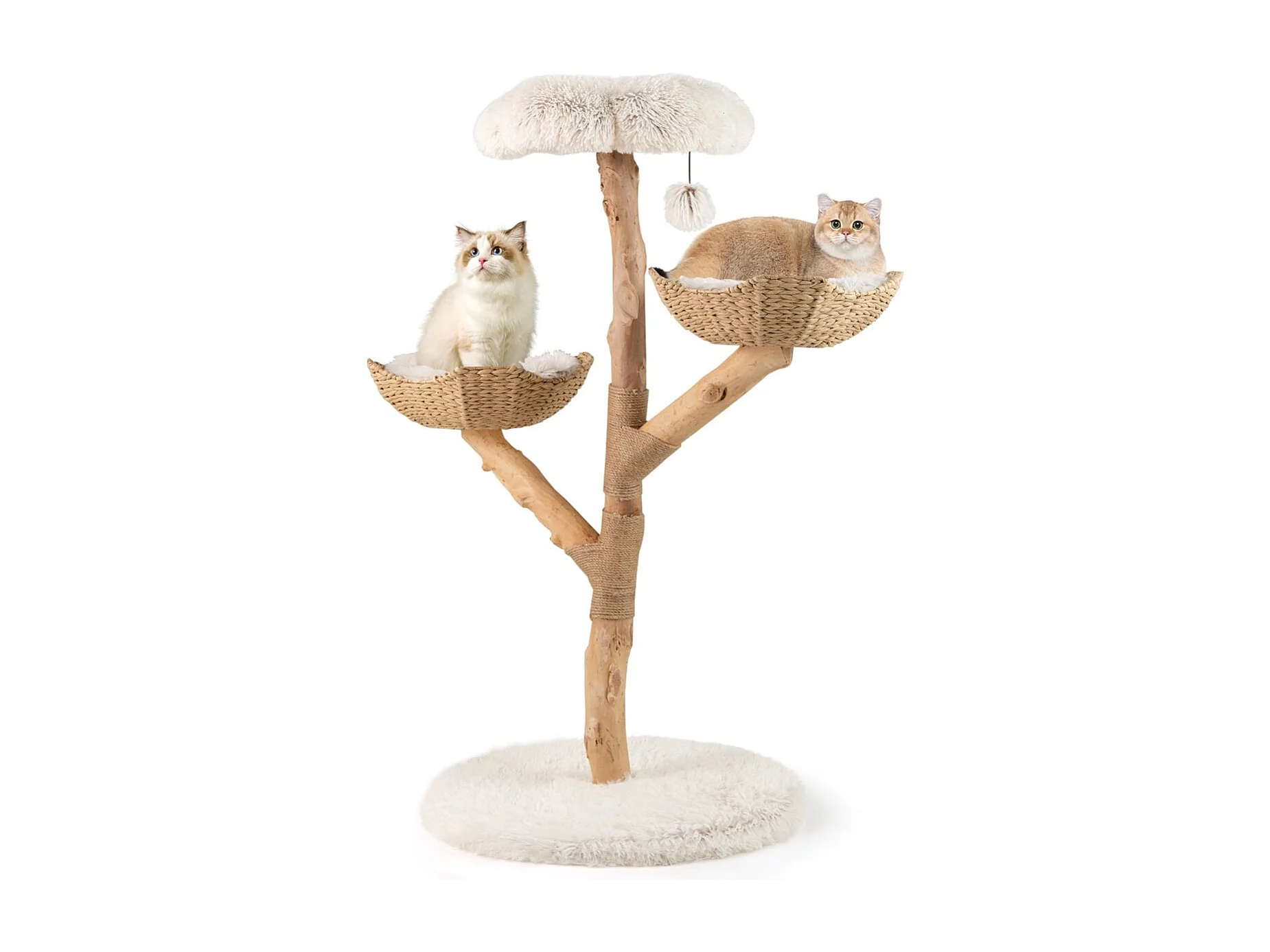 Torre per gattini alta 122 CM con ramo in legno con piattaforma a fiore 2 cesti in rattan, Moderno albero per gatti Bianco