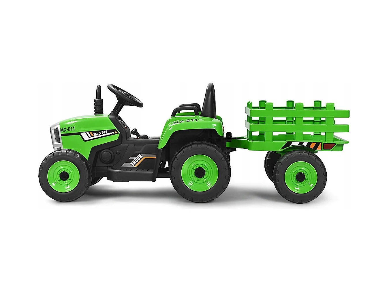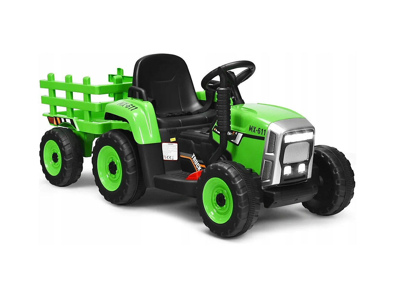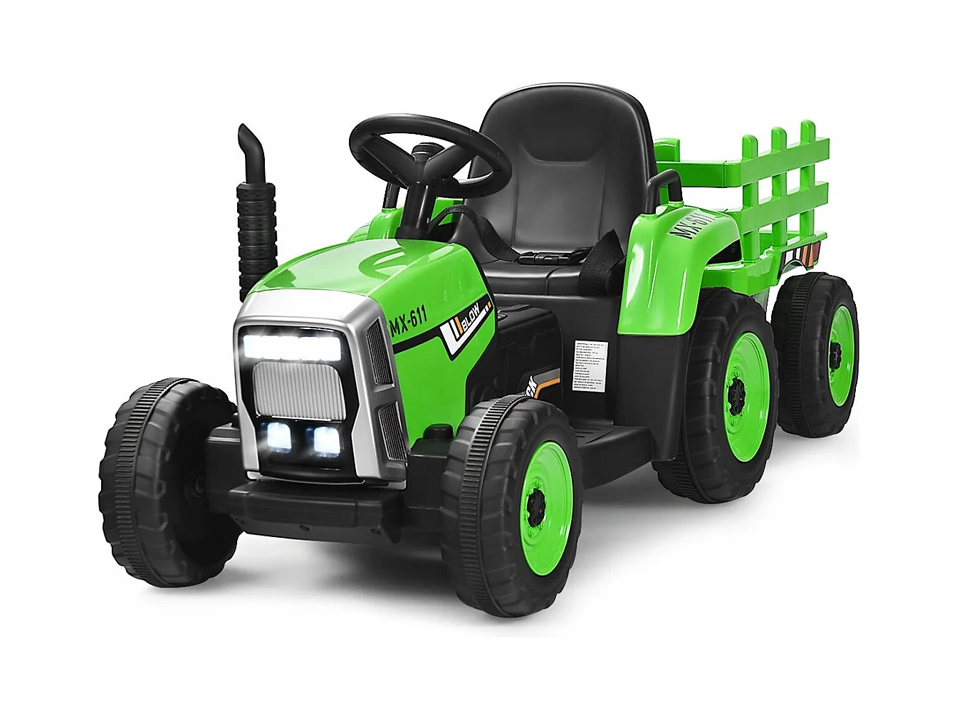 Trattore con rimorchio 12 V per bambini, Giocattolo elettrico con 3 marce luci LED musica clacson Verde