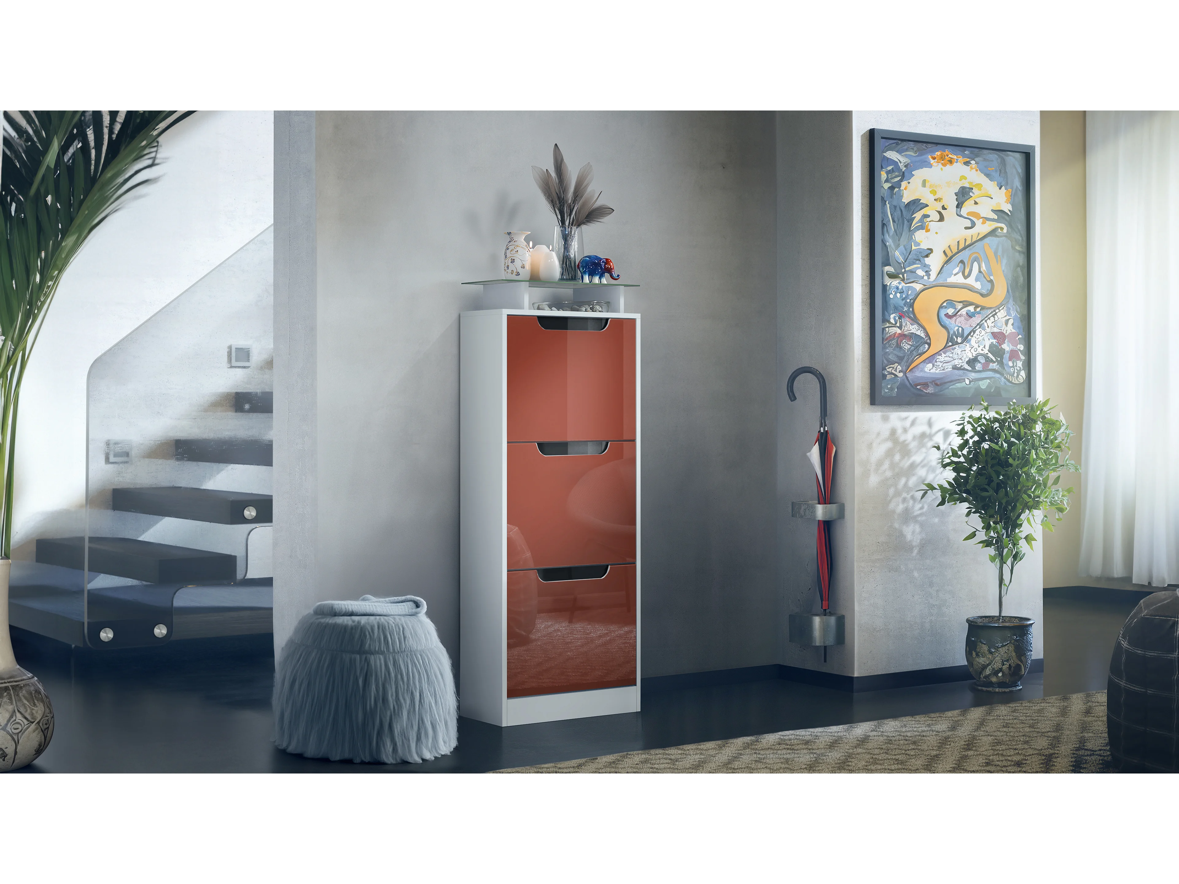 Scarpiera Lavia, mobile per 24 paia di scarpe con 3 ante a ribalta e un ripiano in vetro, bianco opaco/bordeaux lucido (89 x 128 x 23 cm)