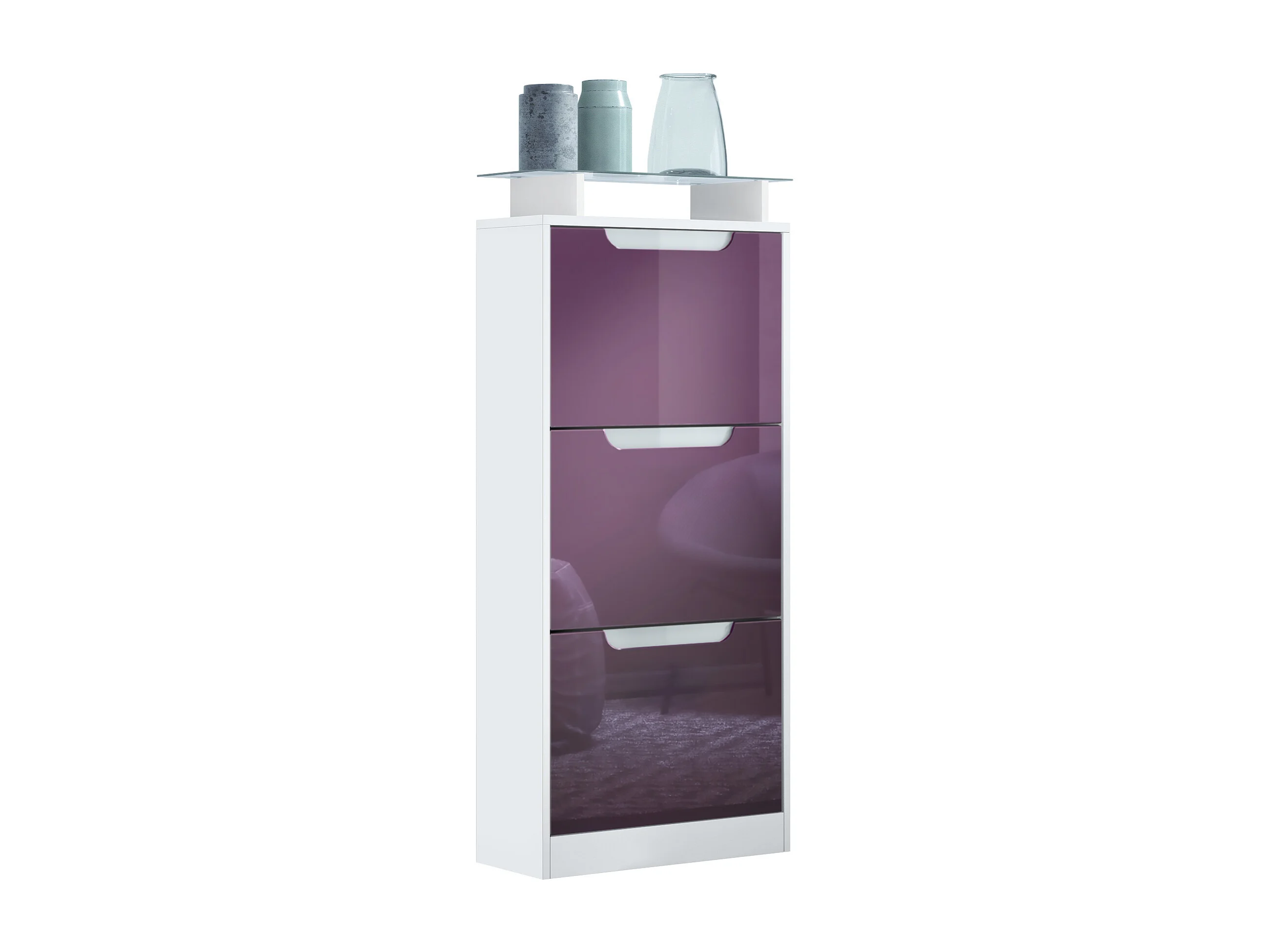 Vladon Scarpiera Lavia V2, Scarpiera per 12 Paia di Scarpe con 3 Ribalte e Mensola in Vetro, bianco opaco/violetto porpora lucido (46 x 128 x 23 cm)